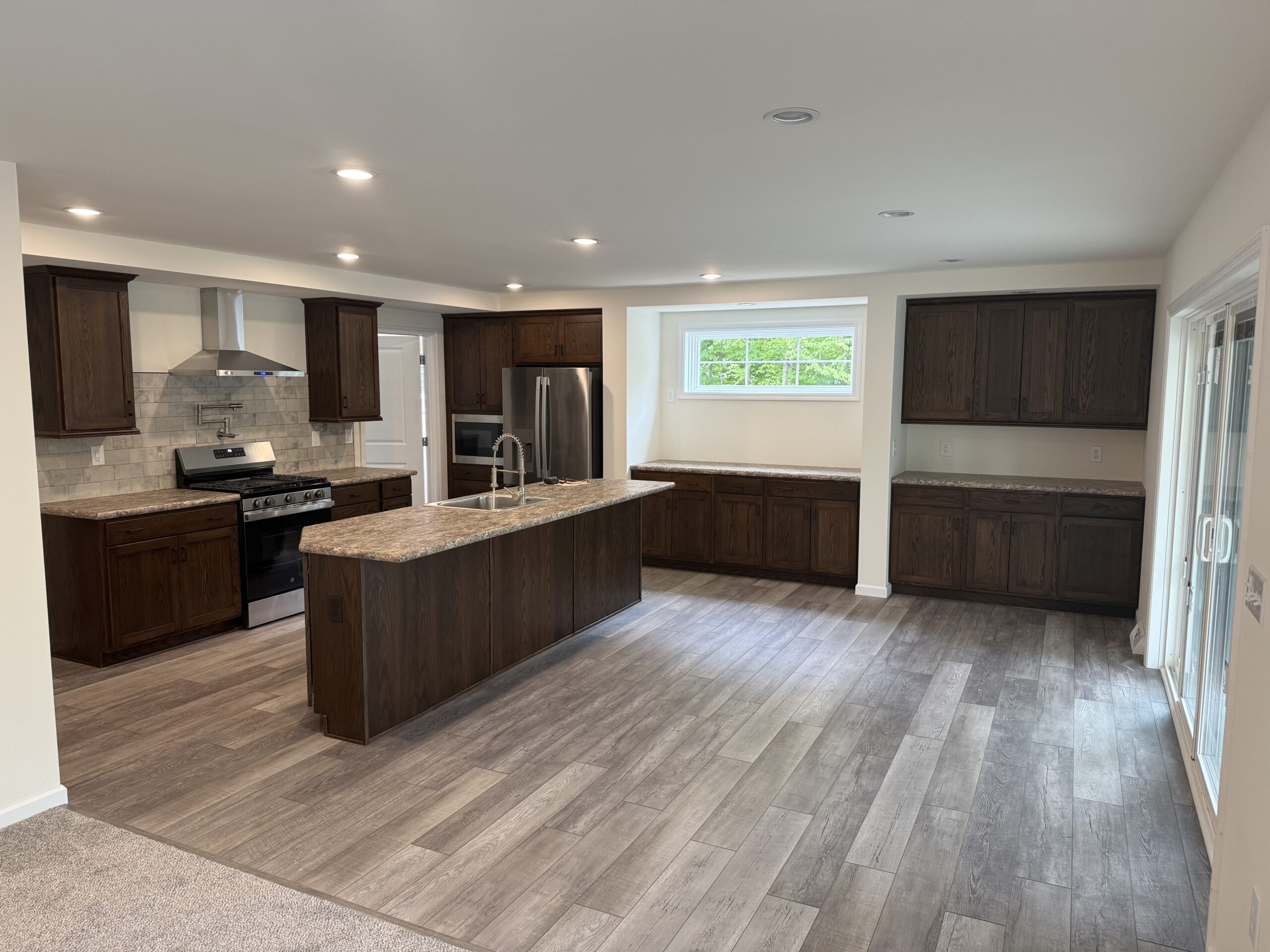 This large Ranch-style home offers the perfect blend of comfort and style, showcasing a covered rear deck, charming saddle roof front porch, cozy gas fireplace, and a spacious eat-in kitchen ideal for family gatherings.